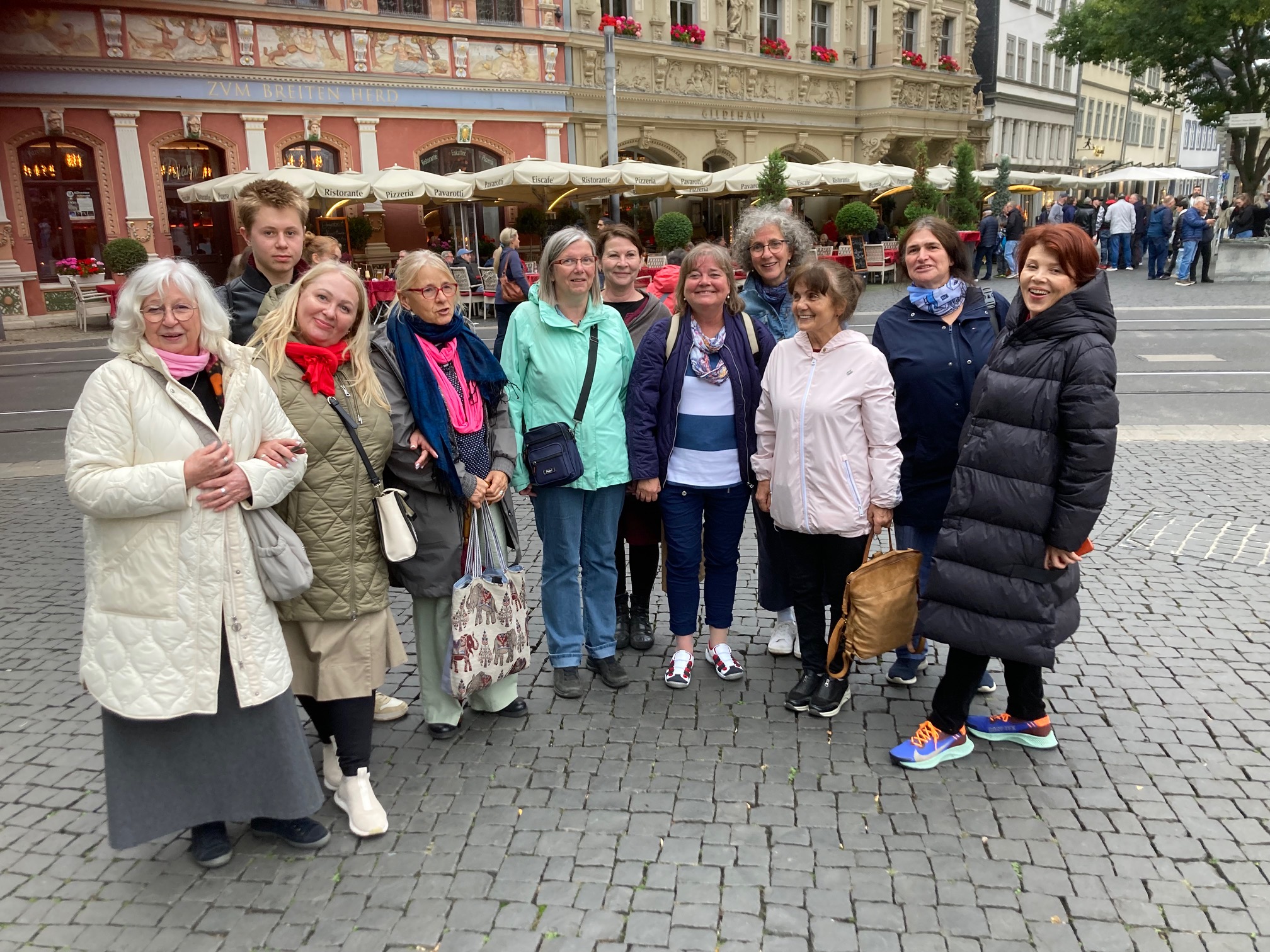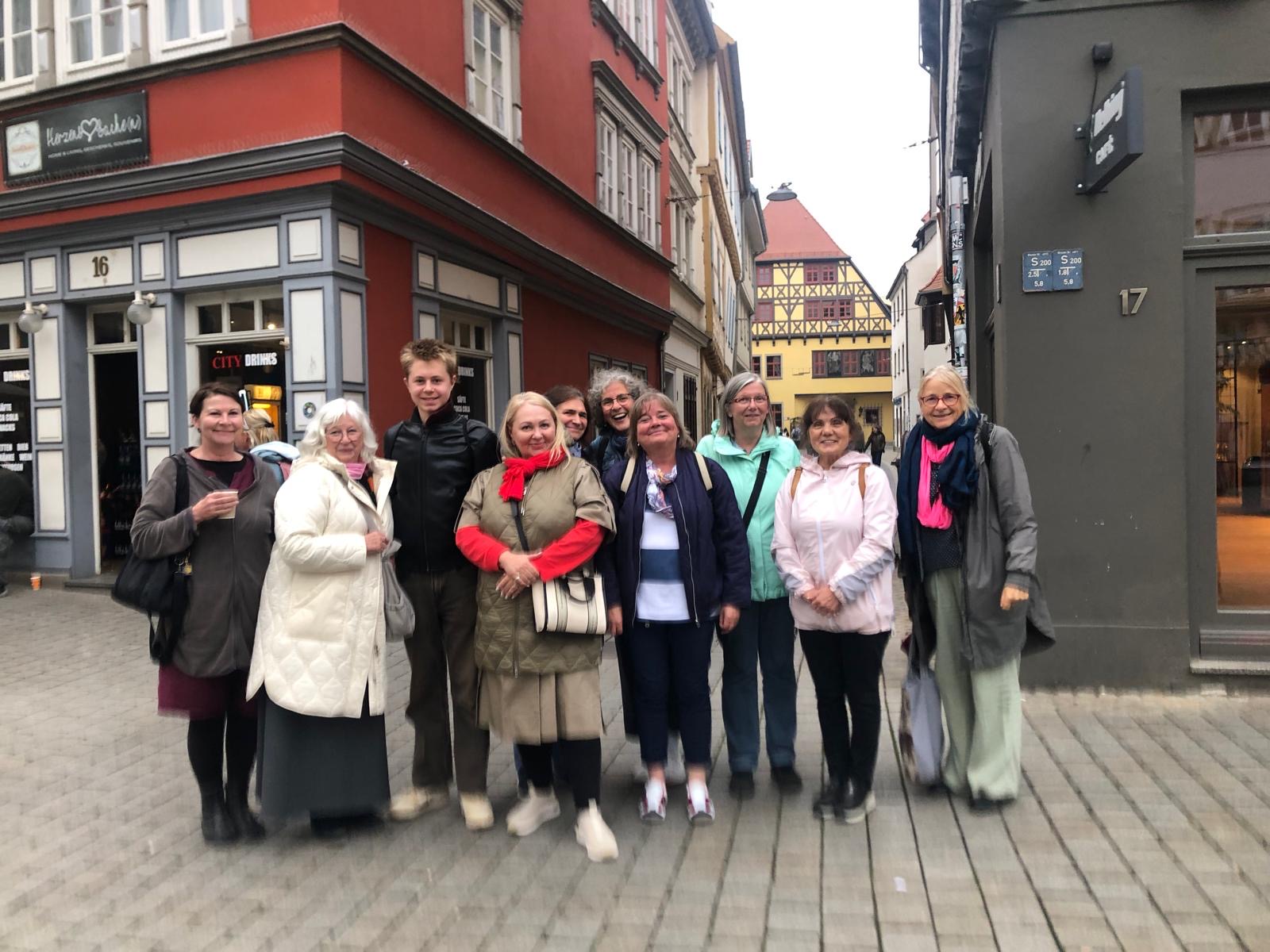 An einem kühlen Sonnabend Ende September trafen wir uns morgens in Leipzig, um nach Erfurt aufzubrechen. Diesmal waren wir auf den Spuren des Antisemitismus unterwegs. In Erfurt wurden wir schon von Marion Schönemann, einer Freundin und Mitarbeiterin im Erinnerungs- und Lernort „Topf und Söhne“ empfangen. Gemeinsam mit Helmut, einem erfahrenen und sehr engagierten Guide, begaben wir uns auf eine beeindruckende Zeitreise. Gespannt lauschten wir seinen Ausführungen und versuchten zu begreifen, wie es möglich war, dass eine renommierte Firma beginnen konnte Lüftungsanlagen für Gaskammern und Verbrennungsöfen für die getöteten Menschen zu bauen. Wir gingen den Fragen nach: „Hätten die Inhaber auch NEIN zu der Anfrage sagen können?“ und „Wie viel wussten sie über die Gräueltaten der Nazis?“. Die Antwort war erschütternd.