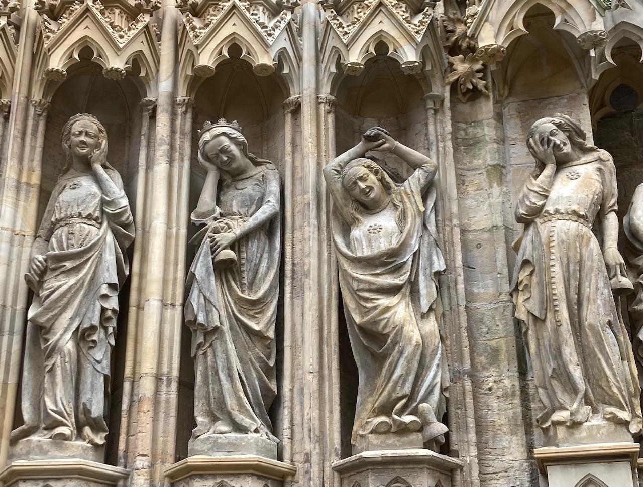 Nach dieser ausführlichen Darstellung mussAten wir uns erst einmal ausruhen und gemeinsam zu Mittag essen. Frisch gestärkt machten wir uns auf den Weg zum Erfurter Dom, wo wir drei Antisemitische Darstellungen aus dem Mittelalter anschauten. Einmal war es die Gegenüberstellung von Ekklesia und Synagoge am Jungfrauenportal, eine „Judensau“ am Chorgestühl und eine Darstellung von einem Juden auf einem Kreuzigungsgemälde. An einer Stele, die die katholische Kirche in Auftrag gegeben hatte und bei der der Künstler die spannungsreiche Geschichte zwischen Kirche und Judentum versucht hat darzustellen, hielt Ernest, ein junger jüdischer Teilnehmer unserer Fahrt, eine kleine Rede. Er rief uns auf an der Seite Israels zu stehen und für den Frieden einzutreten. Das taten wir auch sofort und beteten für Israel und die Juden in der Welt.