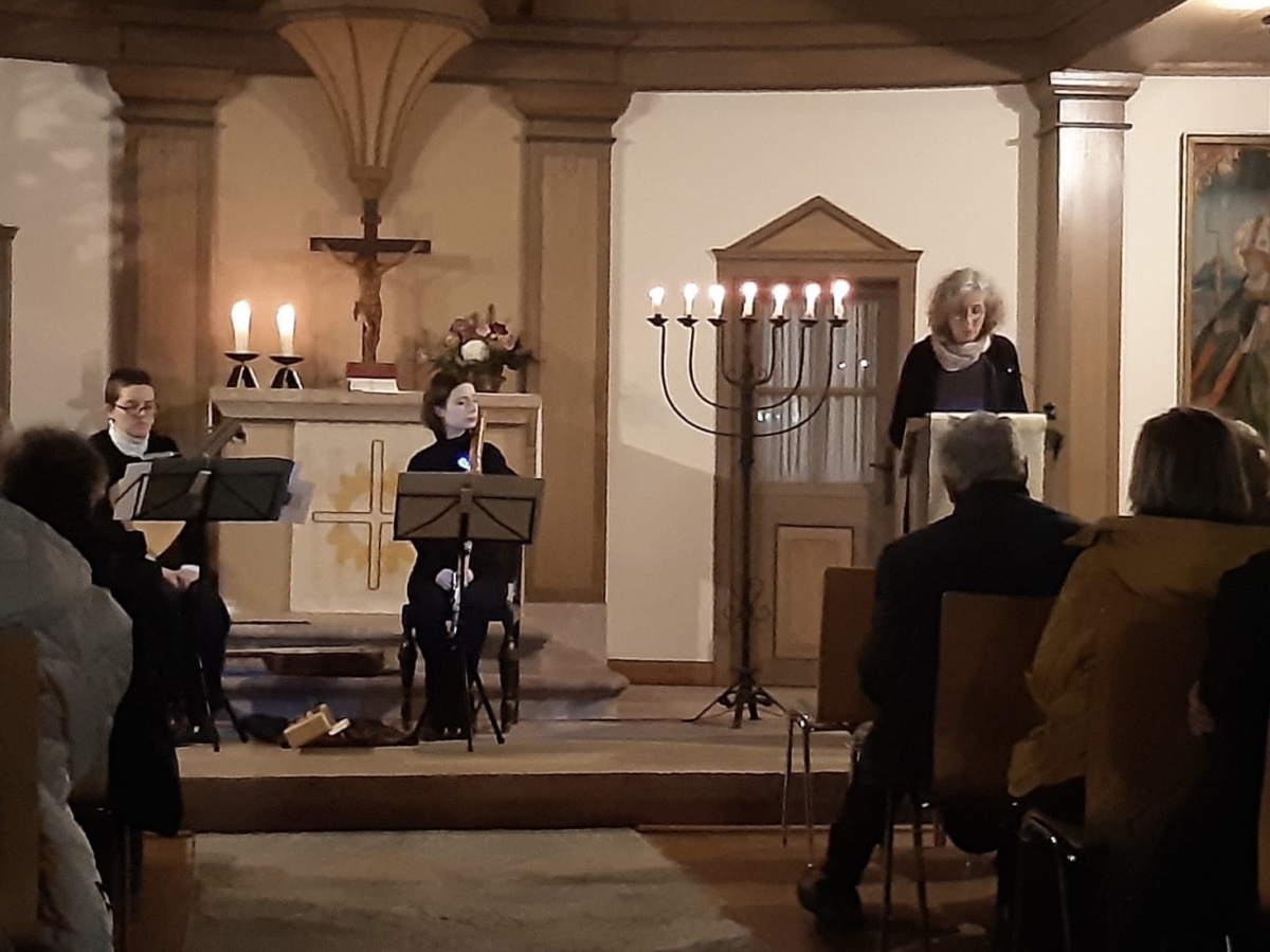 Der Pfarrer der Gemeinde begrüßte uns herzlich und danach begannen wir unser Programm „Ich habe den Todesengel überlebt“. Diesmal spielte Isa Kleinhempel historische Lauteninstrumente und Talida Benndorf sehr unterschiedliche Flöten. Die Atmosphäre war dicht und die Besucher sehr bewegt von der Geschichte von Eva Moses Kor und ihrer Zwillingsschwester.